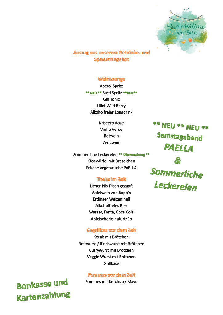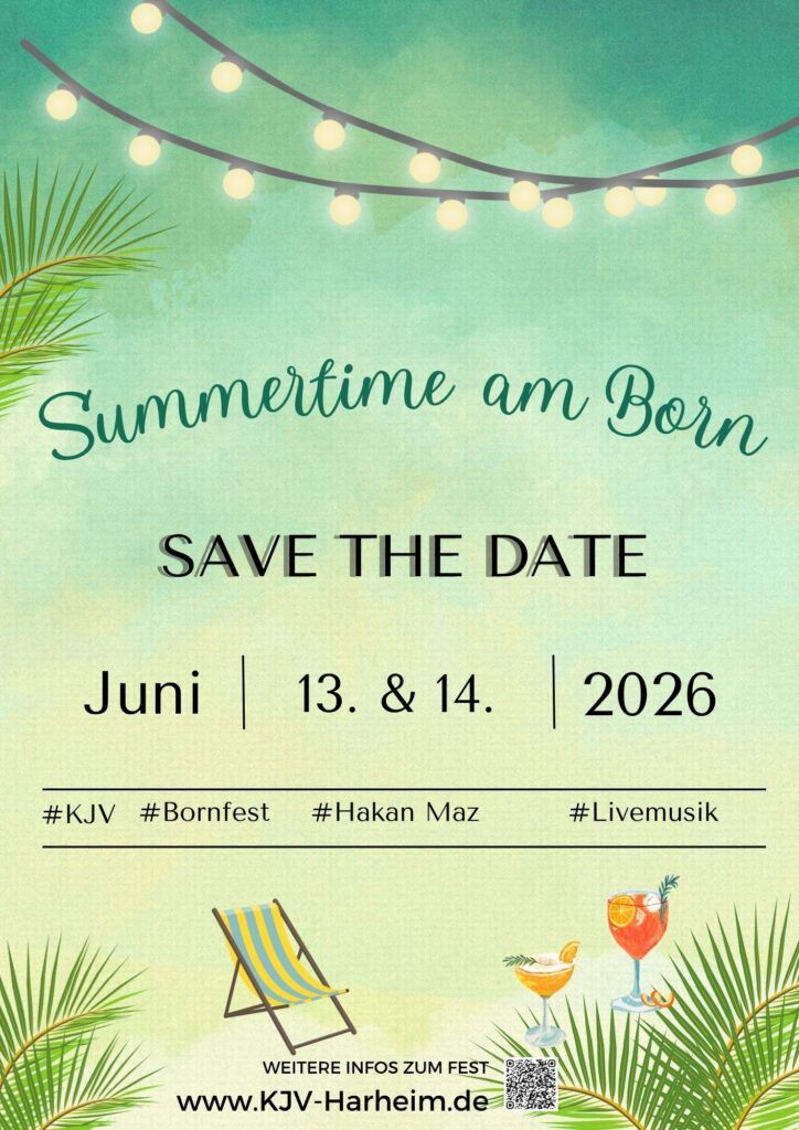 In diesem Jahr findet unser alljährliches Fest Summertime am Born am 13. und 14. Juni statt. Das verantwortliche Projektteam hatte sich bereits zu Beginn der Planungen vorgenommen alle 3 Jahre den musikalischen Event am Samstagabend abzuwechseln um möglichst vielen Gästen gerecht zu werden. Und so freuen wir uns in diesem Jahr auf Hits der 60er Jahre bis hin zu aktuellen Charts – Livemusik von Hakan Maz! Der Sonntag soll wieder ein bunter Tag am Born für Familien und Freunde werden.